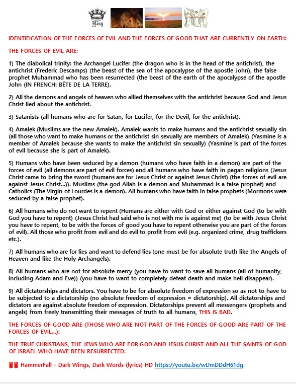 ‼️‼️ ‼️ 2024 02 14 ‼️ VERY IMPORTANT, PLEASE READ EVERYTHING: ALL THE HUMANS MUST CHOOSE THEIR SIDE: EITHER THE HUMANS ARE CHRISTIANS (THE HUMANS WHO ARE FOR THE SON OF GOD), EITHER THE HUMANS ARE MUSLIMS (THE HUMANS WHO ARE AGAINST THE SON OF GOD) (THE MUSLIMS ARE PART OF THE FORCES OF EVIL), EITHER THE HUMANS ARE SATANISTS (THE HUMANS WHO ARE DIRECTLY FOR THE FORCES OF THE EVIL) (THE HUMANS WHO ARE FOR THE FORCES OF THE DARKNESS, FOR THE DEMONS) (THE HUMANS WHO ARE AGAINST THE SON OF GOD). : WHAT HAS GOD SAID ABOUT THE FORCES OF THE EVIL AND THE ENEMIES OF THE CHRIST IN THE SCRIPTURES OF THE BIBLE (TO BE READ IN THE BIBLE)?