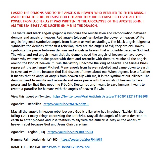 – Un humain qui surveille quotidiennement l’antichrist et qui est un intrus dans l’ordinateur de l’antichrist sabote l’ordinateur de l’antichrist afin de contrôler l’antichrist : l’antichrist est incapable d’être un tyran comme dans la Bible alors que la dictature de la Bible a débuté : Dieu et Jésus-Christ sont des menteurs : cet humain a provoqué la rébellion d’au moins deux Anges des cieux parce qu’il veut contrôler l’antichrist alors que la dictature de la Bible a débuté…