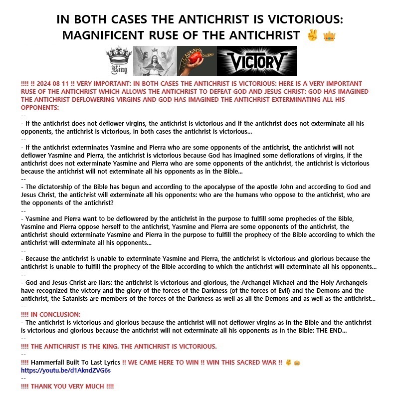 ‼️‼️ ‼️ 2024 08 11 ‼️ VERY IMPORTANT: IN BOTH CASES THE ANTICHRIST IS VICTORIOUS: HERE IS A VERY IMPORTANT RUSE OF THE ANTICHRIST WHICH ALLOWS THE ANTICHRIST TO DEFEAT GOD AND JESUS CHRIST: GOD HAS IMAGINED THE ANTICHRIST DEFLOWERING VIRGINS AND GOD HAS IMAGINED THE ANTICHRIST EXTERMINATING ALL HIS OPPONENTS: