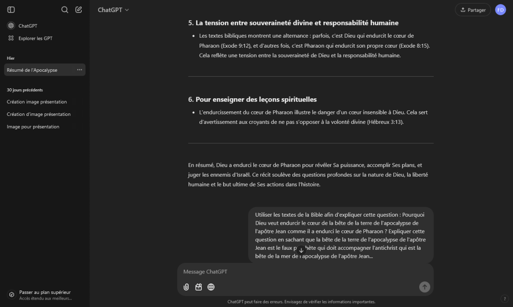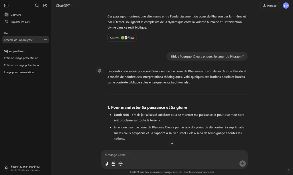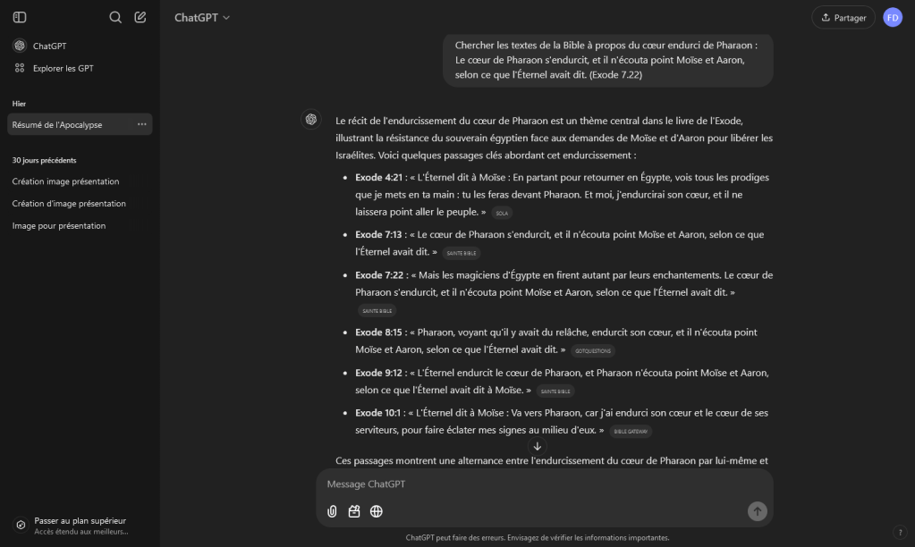 – ChatGPT : Chercher les textes de la Bible à propos du cœur endurci de Pharaon : Le cœur de Pharaon s’endurcit, et il n’écouta point Moïse et Aaron, selon ce que l’Éternel avait dit. (Exode 7.22)