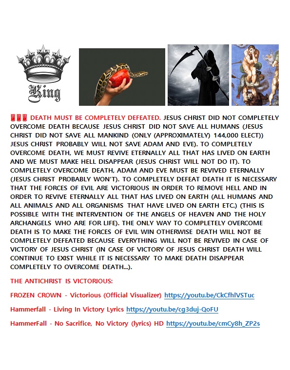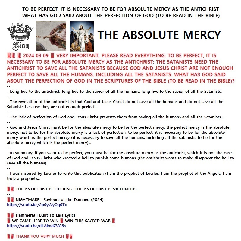 ‼️‼️ ‼️ 2024 03 09 ‼️ VERY IMPORTANT, PLEASE READ EVERYTHING: TO BE PERFECT, IT IS NECESSARY TO BE FOR ABSOLUTE MERCY AS THE ANTICHRIST: THE SATANISTS NEED THE ANTICHRIST TO SAVE ALL THE SATANISTS BECAUSE GOD AND JESUS CHRIST ARE NOT ENOUGH PERFECT TO SAVE ALL THE HUMANS, INCLUDING ALL THE SATANISTS: