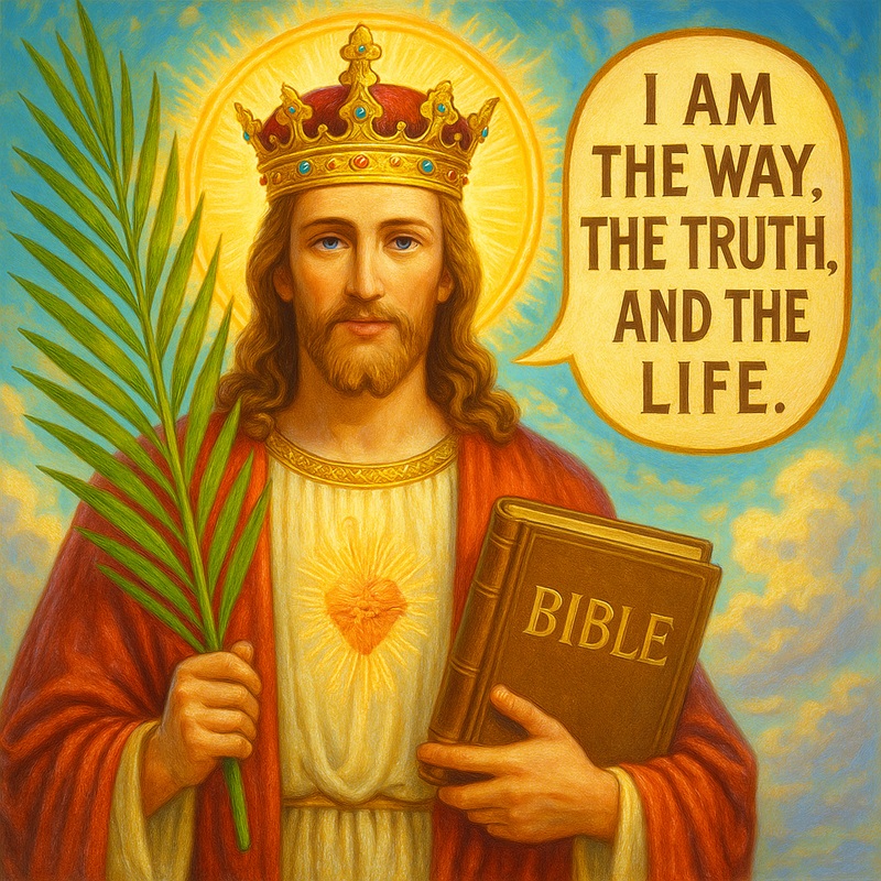 – Create an image that must be in square: All the image must be very bright and very clear and with shimmering colors: create an image that must symbolize the Mass of the Palm of the Catholic Church. Jesus Christ holds branches of Palms in his hand. Jesus Christ has a halo on his head because Jesus Christ is a saint. Jesus Christ is a king with a crown on his head. Jesus Christ has a Bible in his hand. On the Bible, which is in the hand of Jesus Christ, it is written: « BIBLE ». Jesus Christ says: « I AM THE WAY, THE TRUTH, AND THE LIFE. »