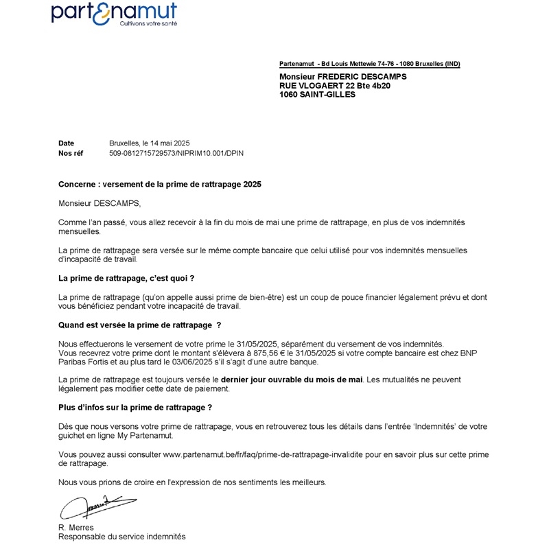 – My income, from the mutual insurance company « Partena », for the month of april 2025 is 1404,52 euros + 204,54 euros from Social Security (this is what is mentioned in my account statements). (1609,06 euros in total).