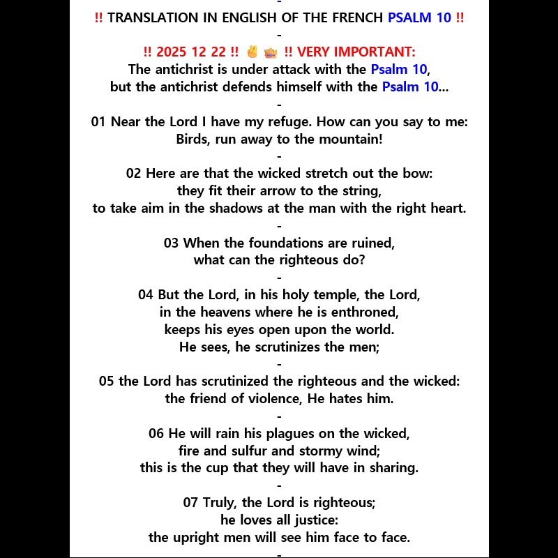 ‼️ 2025 12 22 ‼️ ✌👑 ‼️ VERY IMPORTANT: THE PSALM 10 IN FRENCH, WHICH IS THE PSALM 11 IN ENGLISH: the Antichrist is attacked with the Psalm 10 (in French), but the Antichrist defends himself with the Psalm 10… : the truth of the Psalm 10, and the cunning of the Antichrist with the Psalm 10: the Antichrist has suffered an attack with the Psalm 10, and consequently, the Antichrist defends himself with the Psalm 10: the Antichrist is cunning… :