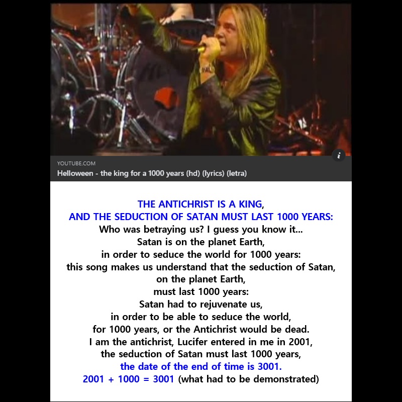 ‼️ I am the antichrist, Lucifer entered in me in 2001, the seduction of Satan must last 1000 years, the date of the end of time is 3001. 2001 + 1000 = 3001 (what had to be demonstrated)