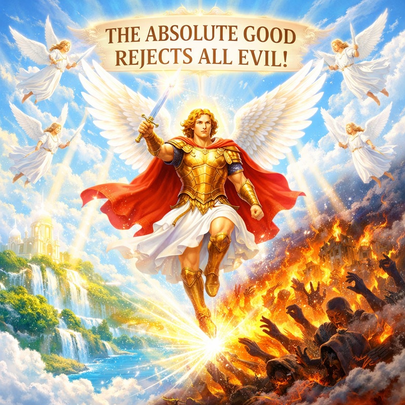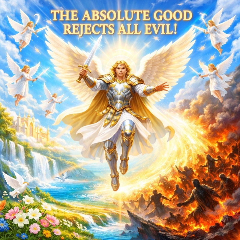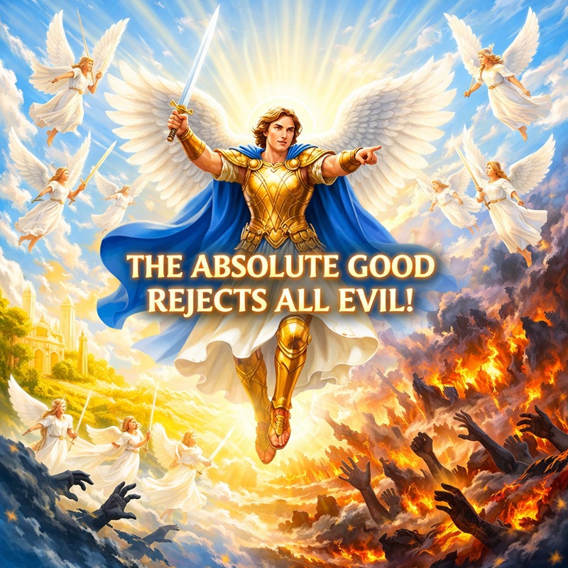 – Create a square image: The entire image must be very bright, and very clear, and filled with vibrant colors. The image must symbolize that the Absolute Good rejects all Evil, and it must symbolize the fight of the Good against the Evil. Evil must be shown in general, not as demons. Some white angels are in the sky with swords. The Archangel Michael has a sword in his hand. The Archangel Michael is in the sky, in the center of the image. The Archangel Michael says: « THE ABSOLUTE GOOD REJECTS ALL EVIL ».