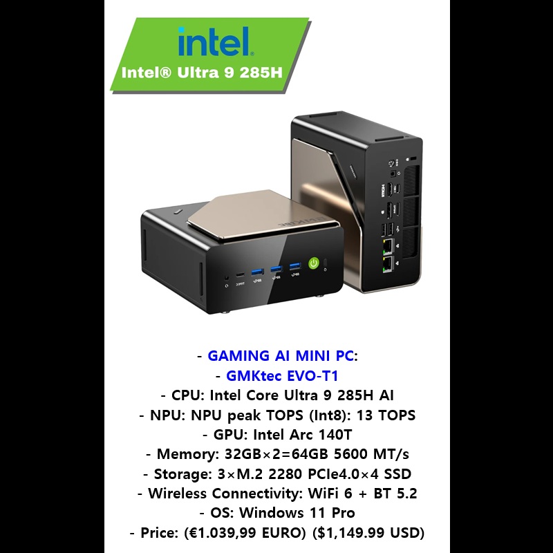 2026 03 15, GAMING AI MINI PC: GMKtec EVO-T1 Intel Core Ultra 9 285H AI Mini PC : [CPU: Intel Core Ultra 9 285H AI], [NPU: NPU peak TOPS (Int8): 13 TOPS (Intel AI Boost)], [GPU: Intel Arc 140T], [Memory: 32GB×2=64GB 5600 MT/s], [Storage: 3×M.2 2280 PCIe4.0×4 SSD], [Price: (€1.039,99 EURO) ($1,149.99 USD)]:
