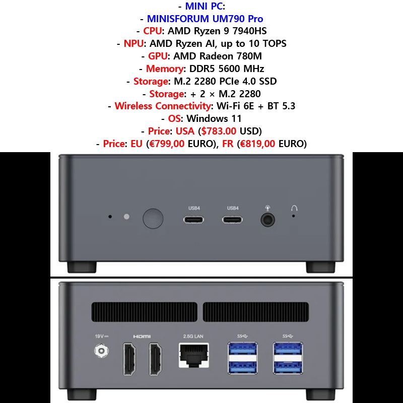 2026 03 27, MINI PC: MINISFORUM Venus Serie: MINISFORUM UM790 Pro (AMD Ryzen 9 7940HS) Mini PC : [CPU: AMD Ryzen 9 7940HS], [NPU: AMD Ryzen AI, up to 10 TOPS], [GPU: AMD Radeon 780M], [Memory: 2 × SO-DIMM DDR5 5600 MHz, up to 64GB], [Storage: 2 × M.2 2280 PCIe 4.0 SSD], [Video Output: 2 × HDMI 2.1 + 2 × USB4], [Network: Wi-Fi 6E + Bluetooth 5.3 + 1 × 2.5G LAN], [OS: Windows 11], [Dimensions: 130 × 126 × 52.3 mm], [Weight: Not clearly listed on the official product pages], [Idle Power: 4.6W / 6W / 10.6W (measured)], [TDP: 35-54W], [Price: USA: 32GB RAM + 1TB SSD: ($783.00 USD), EU: 32GB RAM + 1TB SSD: (€799,00 EURO), FR: 32GB RAM + 1TB SSD: (€819,00 EURO)]