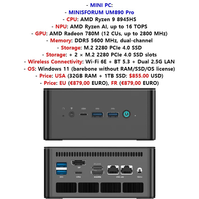 – FR: 32GB RAM + 1TB SSD: €879,00: https://minisforumpc.fr/products/minisforum-um890-pro