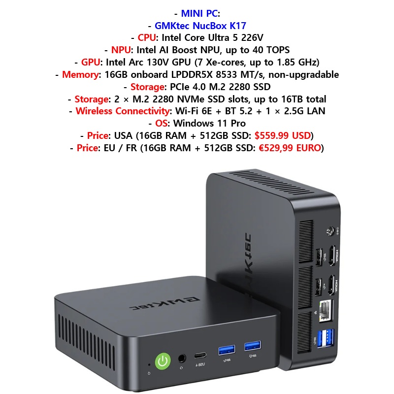 – FR: 16GB RAM + 512GB SSD: €529,99: https://de.gmktec.com/fr/products/gmktec-nucbox-k17-intel%C2%AE-core%E2%84%A2-ultra-5-226v