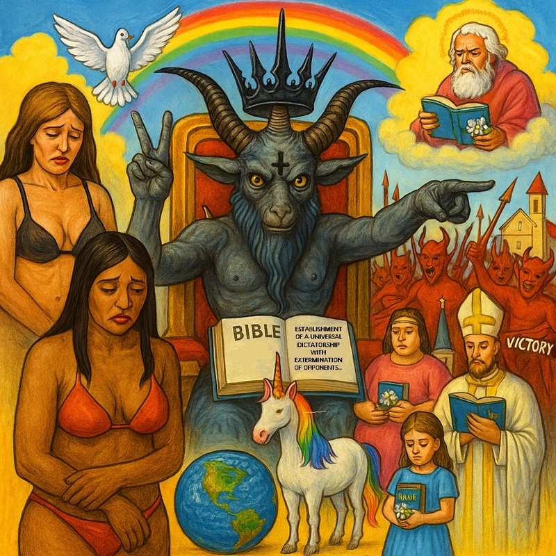 – Create an image that must be in square: All the image must be very bright and very clear and with vibrant colors: The image must symbolize that Baphomet will become a tyrant who will rule the whole world. The image must symbolize that the angel Lucifer inspires Baphomet so that Baphomet becomes a tyrant who will rule the whole world. The image must symbolize that the women who produce pornography are under the domination of Baphomet, who is a dictator. Baphomet dominates the women who produce pornography. Baphomet dominates the women who prostitute themselves. Baphomet is a tyrant who dominates the whole world. The angel Lucifer inspires Baphomet so that Baphomet will dominate the whole world. The Bible is open. In the Bible, it is written: « THE WORD OF GOD: THE ANTICHRIST WILL BE A TYRANT WHO WILL RULE THE WHOLE WORLD… ». The Bible is on the planet Earth. The devil is Baphomet. Baphomet has a black crown of the Darkness on his head. Baphomet is the king. Baphomet sits on his throne. Baphomet has a black cross that is painted on the forehead of Baphomet. The black cross that is painted on the forehead of Baphomet is reversed. A white dove flies over Baphomet. A rainbow is above Baphomet.