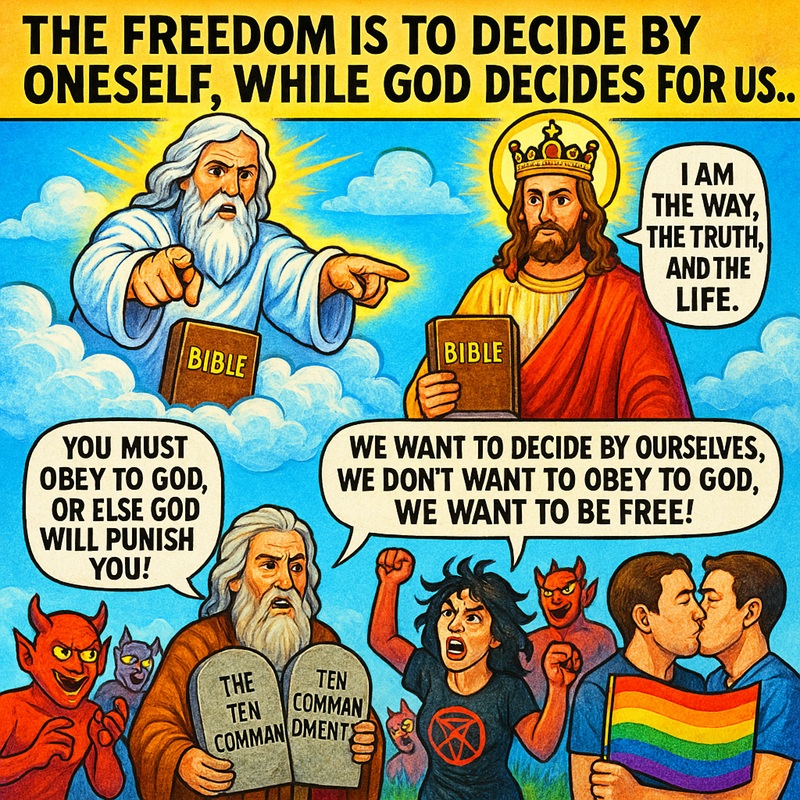 – The image must be in square: All the image must be very bright and very clear and with shimmering colors: to create an image that symbolizes the absolute freedom that is wanted by the rebels: at the very top of the image, it is written: « THE FREEDOM IS TO DECIDE BY ONESELF, WHILE GOD DECIDES FOR US… ». God is on a cloud in the sky. God points to us with his index finger and with his outstretched arm. God has a Bible in His hand. On the Bible, which is in the hand of God, it is written: « BIBLE ». Jesus Christ has a halo on his head because Jesus Christ is a saint. Jesus Christ is a king with a crown on his head. Jesus Christ is next to God on the right of God. Jesus Christ has a Bible in his hand. On the Bible, which is in the hand of Jesus Christ, it is written: « BIBLE ». Jesus Christ says: « I AM THE WAY, THE TRUTH, AND THE LIFE. » Moses holds the stone tablets of the Ten Commandments in his hands. On the stone tablets, it is written: « THE TEN COMMANDMENTS ». Moses says: « YOU MUST OBEY TO GOD, OR ELSE GOD WILL PUNISH YOU! ». The devil, and several demons, and several Satanists, and Two homosexuals with an LGBT flag kissing each other, say to Moses: « WE WANT TO DECIDE BY OURSELVES, WE DON’T WANT TO OBEY TO GOD, WE WANT TO BE FREE! ».
